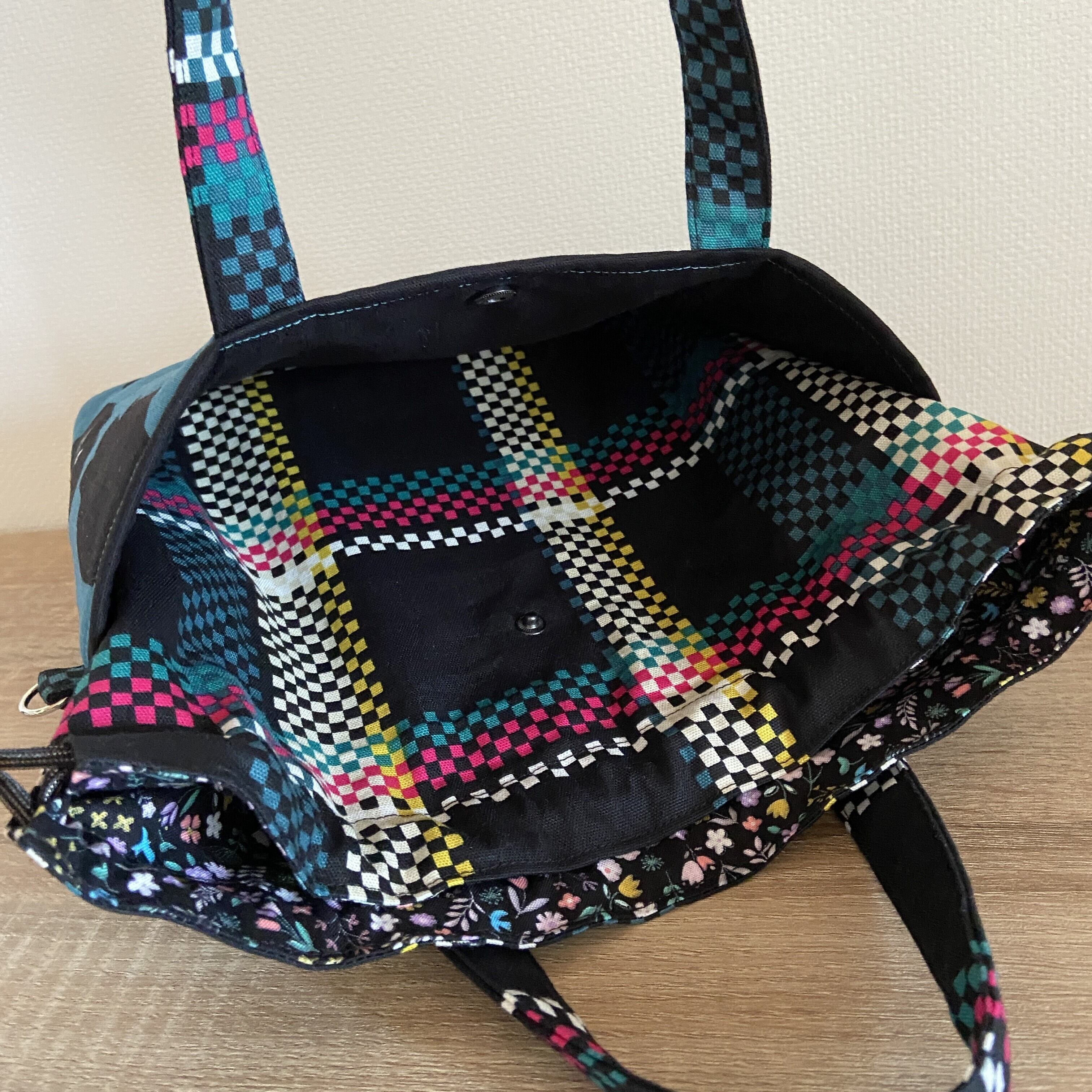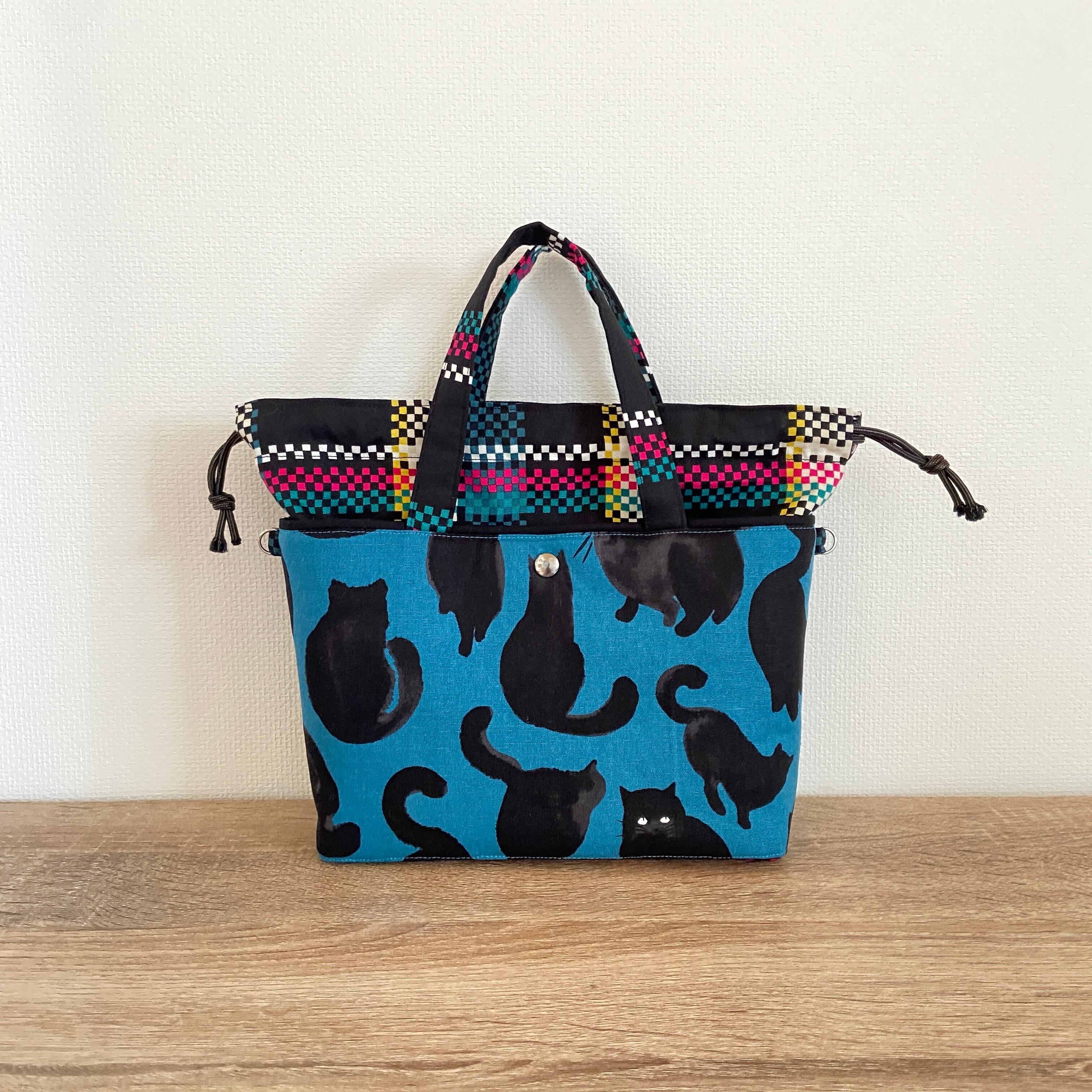 前後に猫柄のあおりポケットがついた巾着バッグです。
