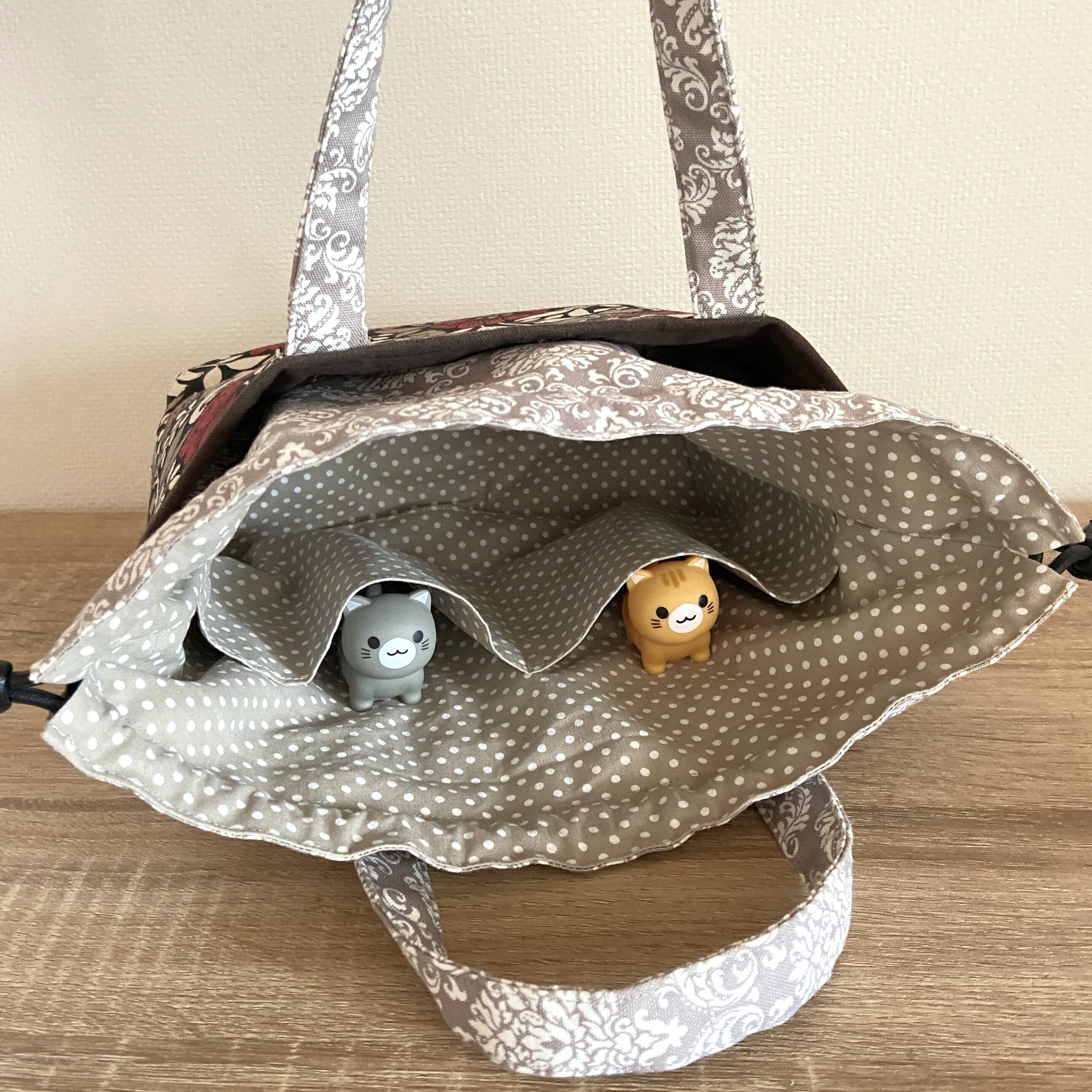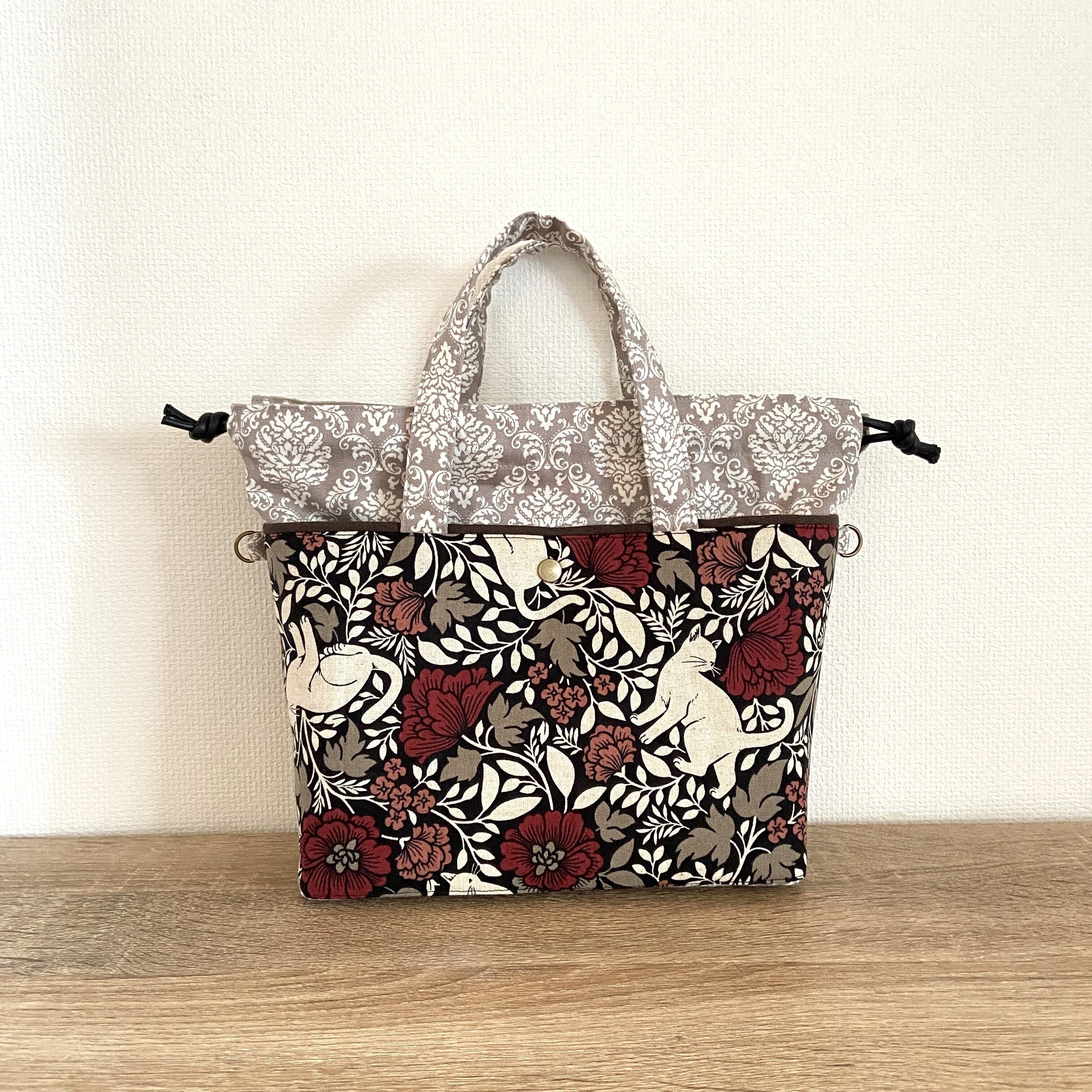 前後に猫柄のあおりポケットがついた巾着バッグです。