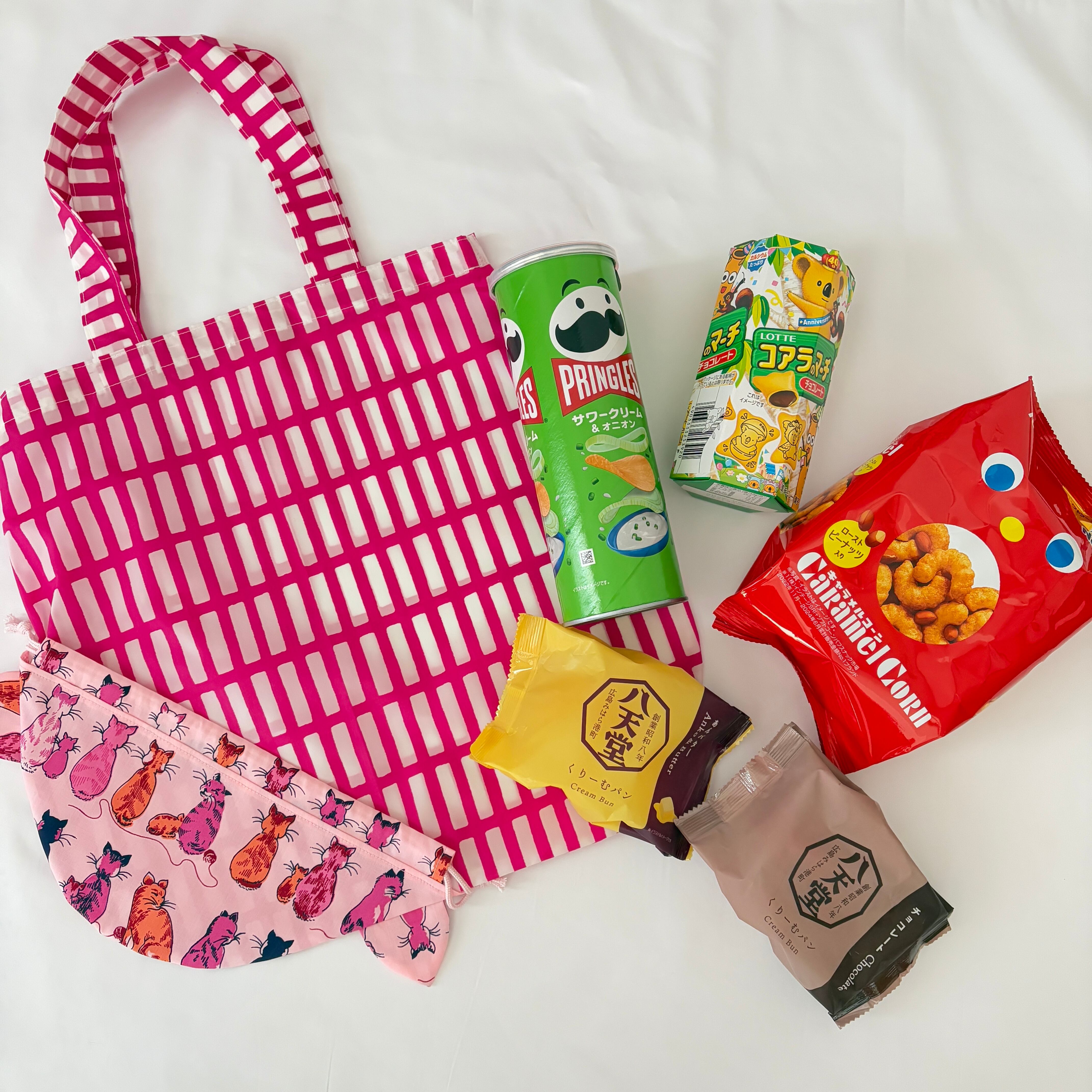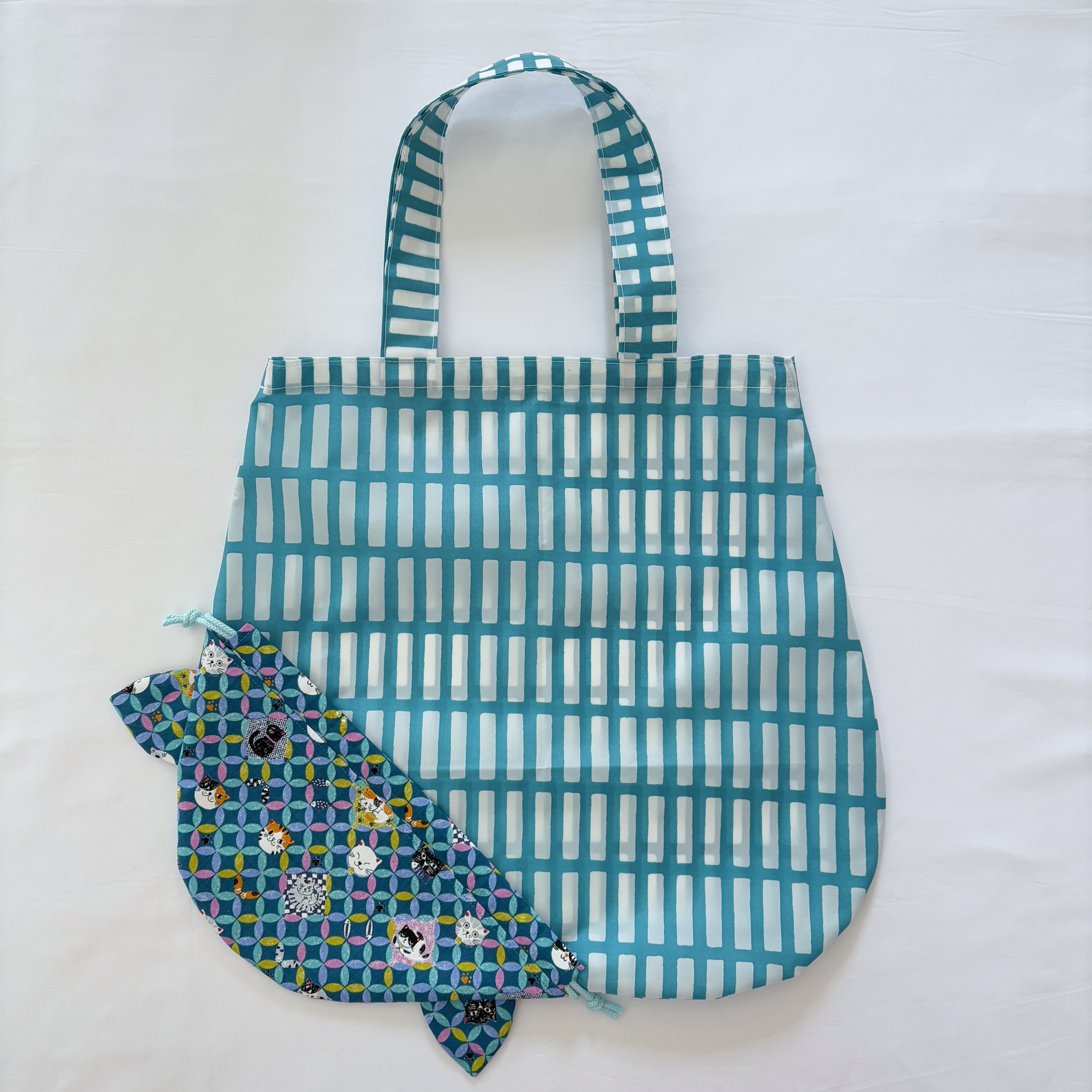 左下の猫柄布にバッグ本体を収納して巾着紐を絞るとネコ型になります。