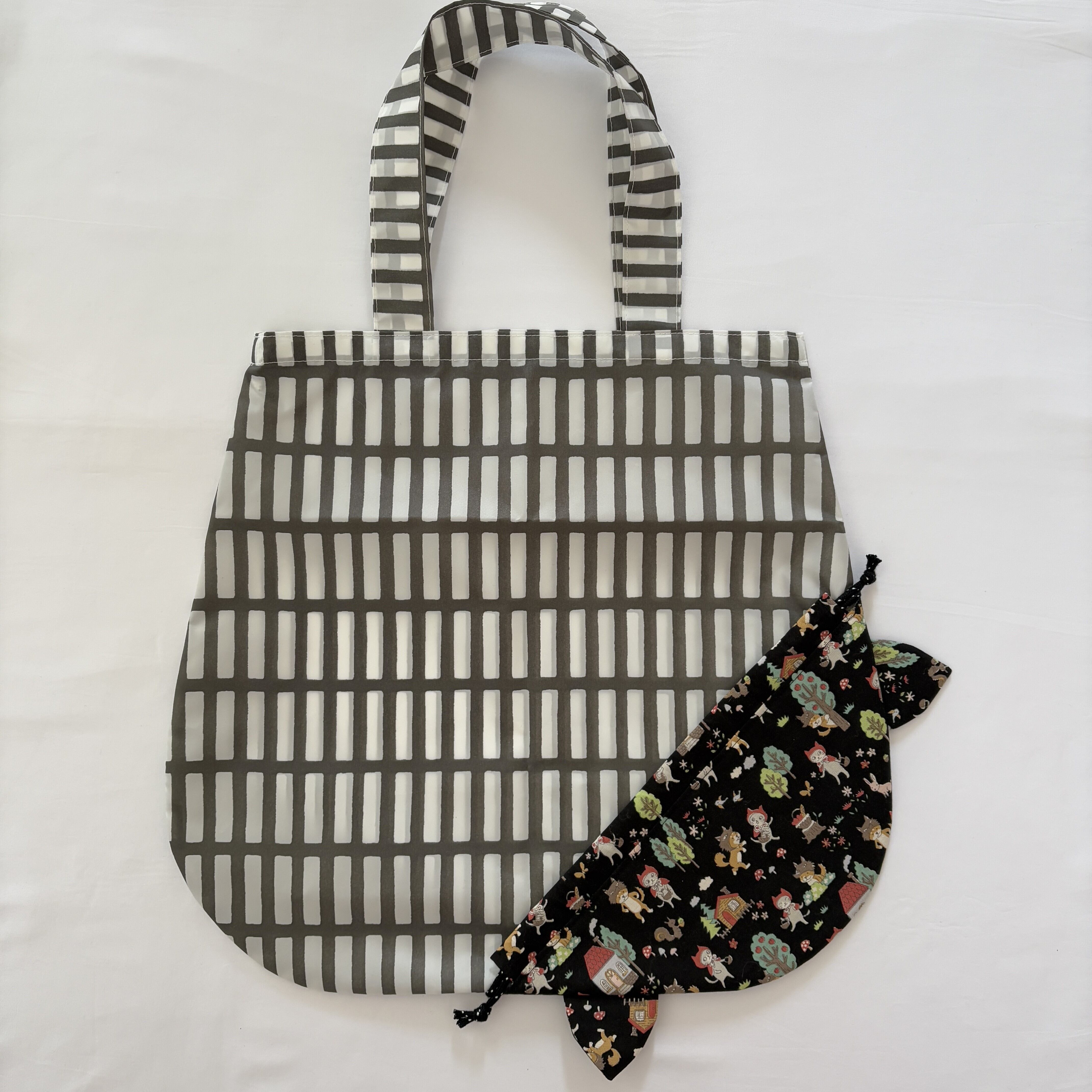 左下の猫柄布にバッグ本体を収納して巾着紐を絞るとネコ型になります。