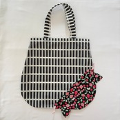 左下の猫柄布にバッグ本体を収納して巾着紐を絞るとネコ型になります。